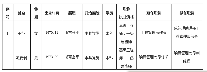 【概要描述】 为了加强对干部选拔工作的监督,提高识别和任用干部的准确程度,现对公司党委会、董事会研究决定的王征、毛兵利同志拟任职务进行任前公示: