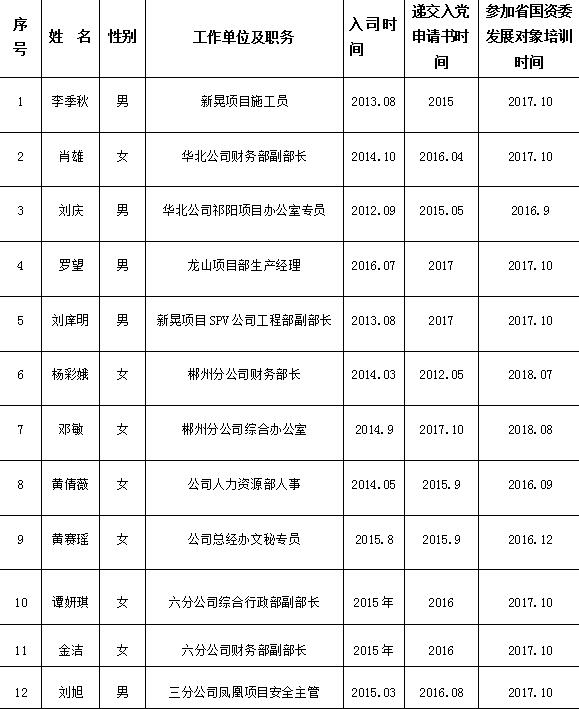 公司党委按照《中国共产党章程》要求,本着积极慎重、分批发展的原则,拟在近期发展一批新党员。现就拟发展的新党员名单进行公示,公示期七个工作日(2019年9月24日至2019年9月30日)。如对公示对象有不同意见和建议,请在公示期内实名向公司党委办报告,联系人:胡蒿、成雯婕,联系电话:85191210。