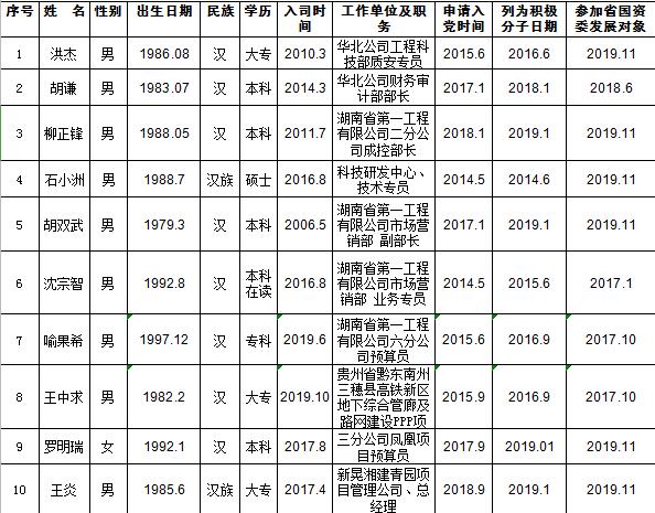公司党委按照《中国共产党章程》要求,本着积极慎重、分批发展的原则,拟在近期发展一批新党员。现就拟发展的新党员名单进行公示,公示期三个工作日(2020年7月6日至2020年7月9日)。如对公示对象有不同意见和建议,请在公示期内实名向公司党委办报告,联系人:贺耿、成雯婕,联系电话:85191269。